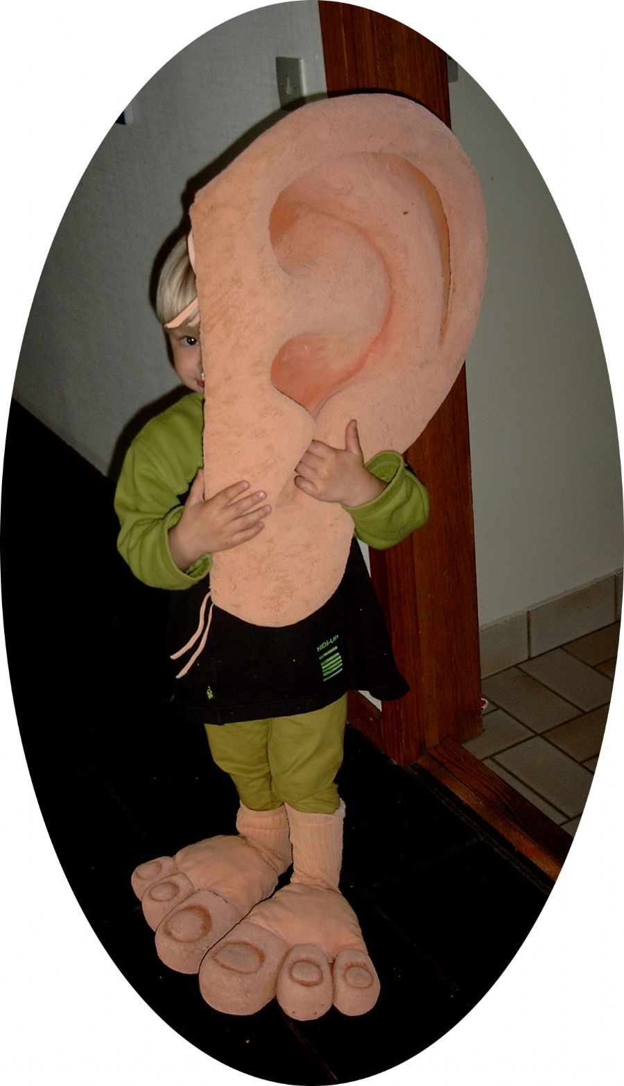 Øret er skåret og klippet ud af to lag skummadras, limet sammen. og bemalet. Var oprindeligt del af et stort dukkekostume. "Sansedyret"