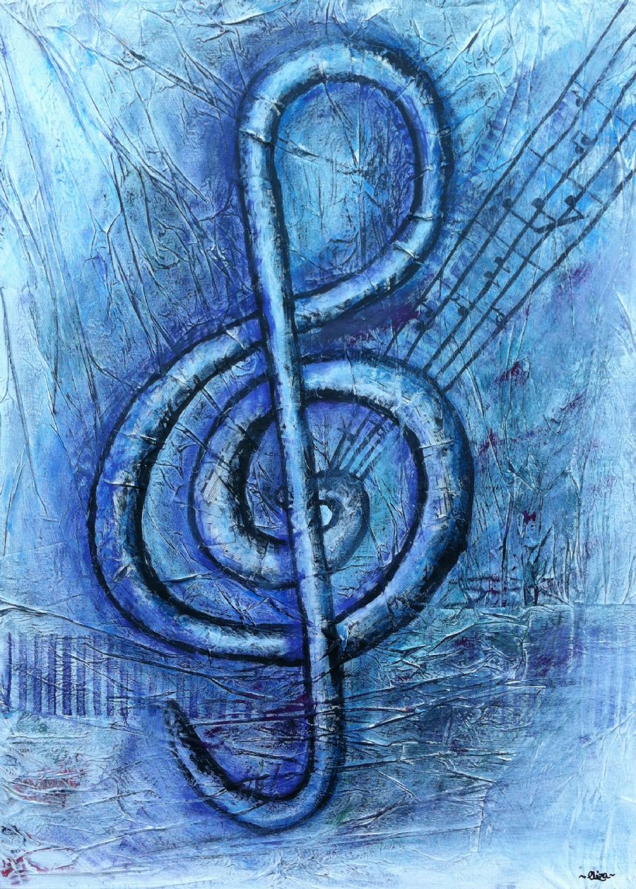 Lad musikken spille, også til de skæve toner.. Alt i livet behøver slet ikke gå lige "efter bogen".. Slap af og hvil i dig selv. Ingen er perfekte. Gå din helt egen vej og spil din egen melodi. (Derfor er G-nøglen ikke malet helt "korrekt".) Akryl og mixed media. Solgt.