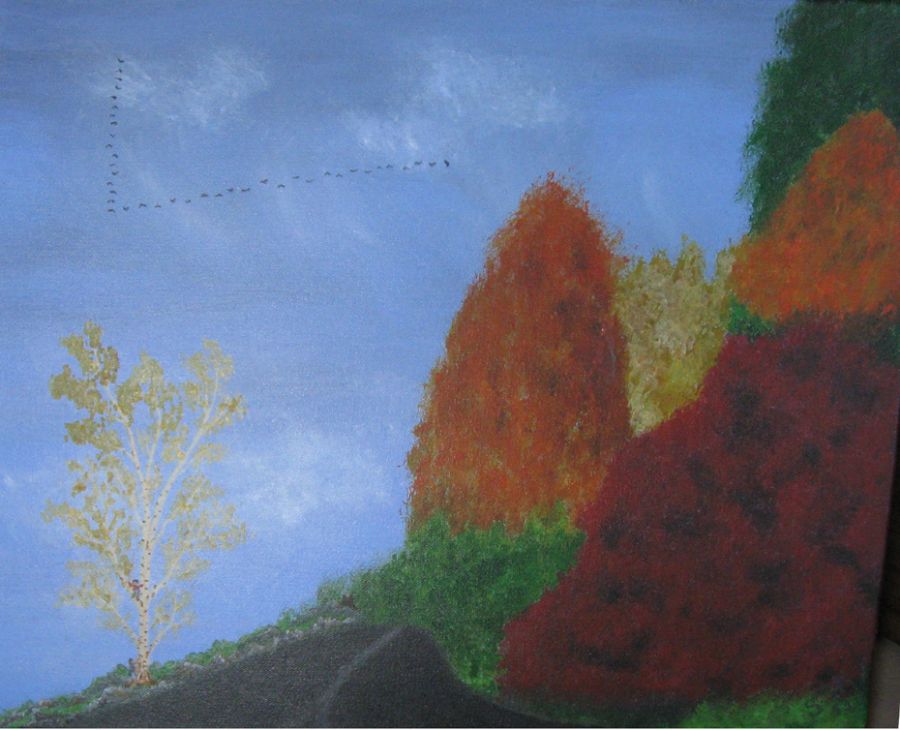 Mit maleri nr. 28. Acryl på lærred. Maleriet er fri fantasi. Motivet viser nogle træer i efterårsdragt, et par børn der kravler op i et træ, da de har fået øje på en stor bjørn, samt en flok gæs på træk.
