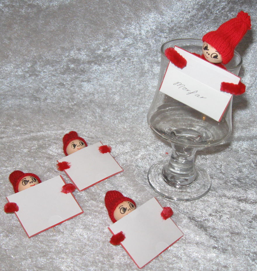 Nisse med udskifteligt navneskilt (da morfar ikke nødvendigvis er med hvert år :-)) til glas. Pris for sæt med 4 stk. 50 kr.