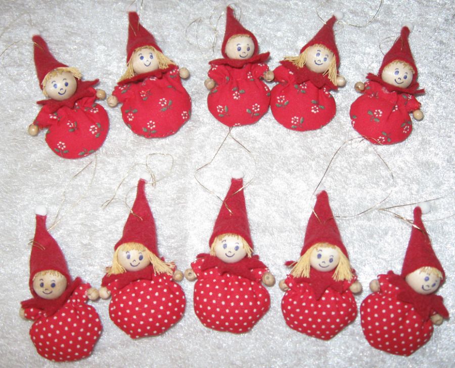 Små vat-nissepiger til ophæng på f.eks. troldhasselgren. Pris for 5 stk. 20 kr.