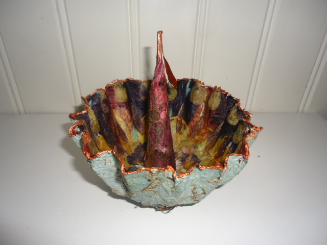 Skål med lille spir, lavet af Limfjordspapir og foret med en "blomstereng".