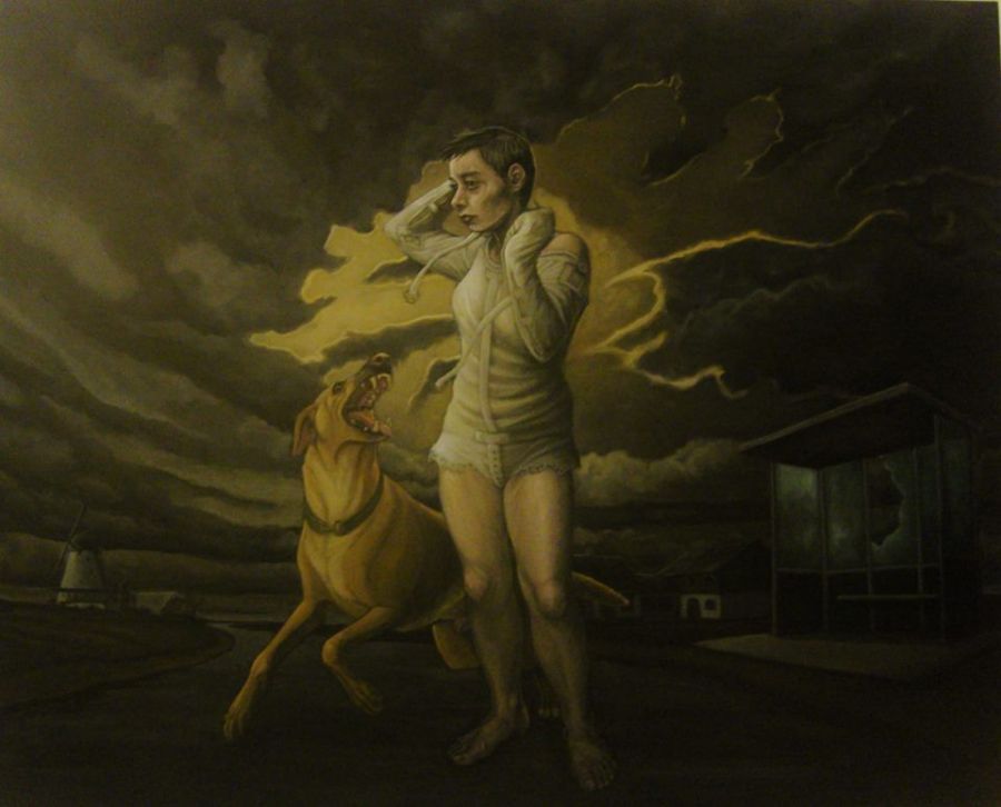 Syg pige med hund, i baggrunden ses busskur og mølle