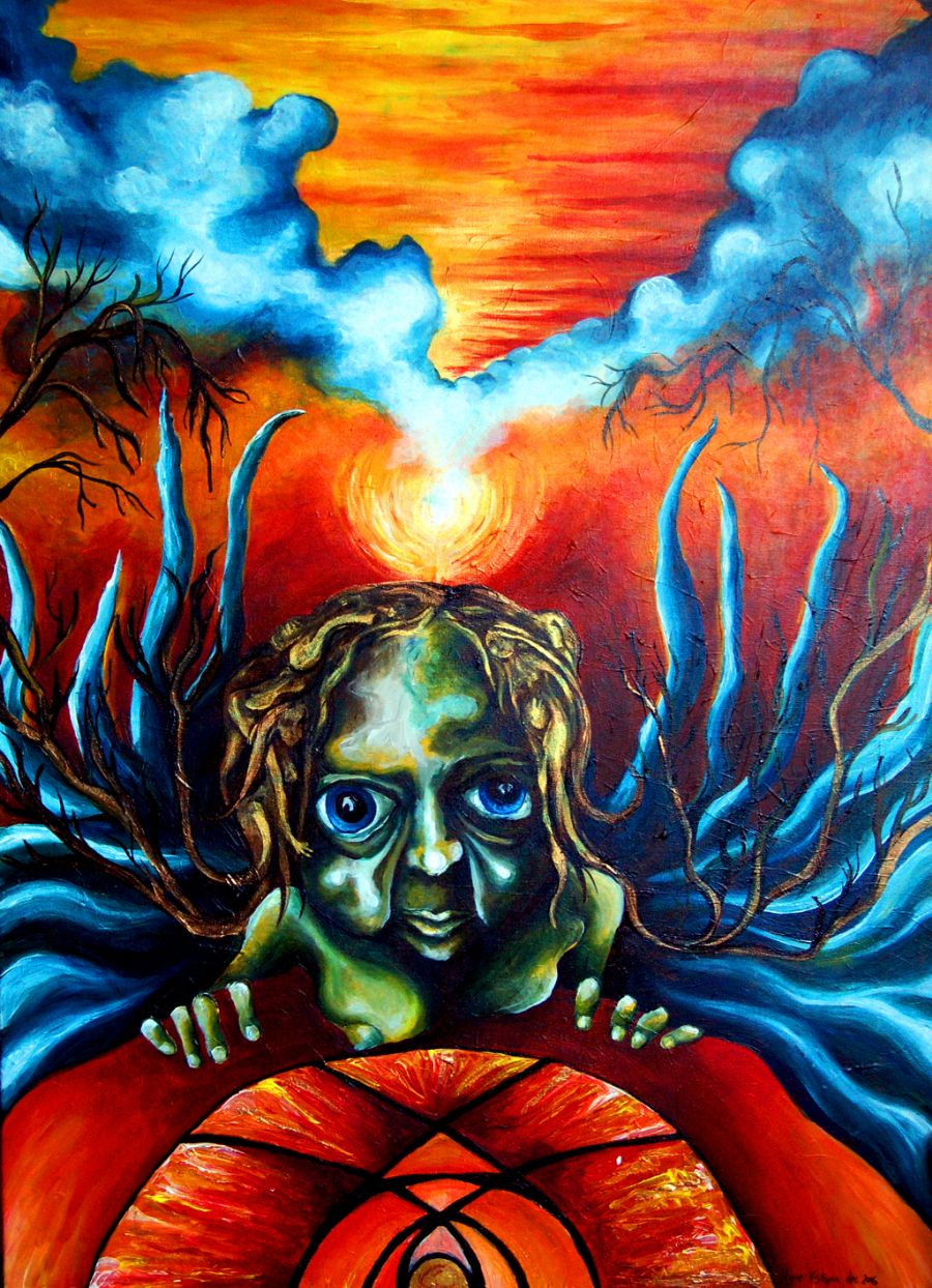 Her er et billede, der virkeligt har nogle meget stærke og smukke farver. Og så sidder det lille mærkelige væsen der i midten og stirrer lidt fortabt på mig. Meget flot. TAK for en god oplevelse.