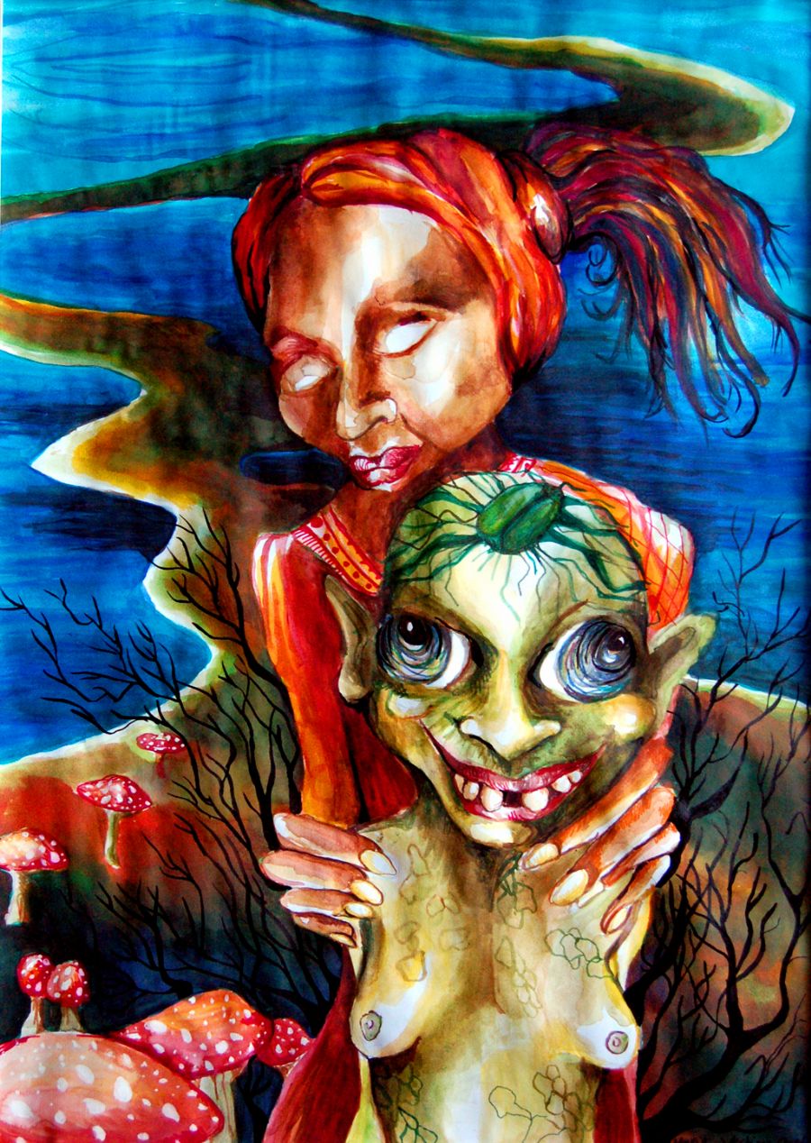 Det er et fantastisk billede. Det underbevidste, drømmen og alt det vi ikke kan se i dagslyset kommer frem. Kompositionen og farvevalg er lige i øjet og de to lettere forvrængede kvinder fremstår klart i deres eget univers. Kan man stole på intuitionen ? Det er det spørgsmål jeg får af at se på billedet. Det går lige ind. Havet, tangen og fluesvampene er skøn symbolik. I det hele taget, Maries billeder er i et univers for sig :),