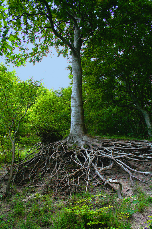 jorden er regnet væk under træet, og der er ikke meget jord rødderne kan holde fast i mere.