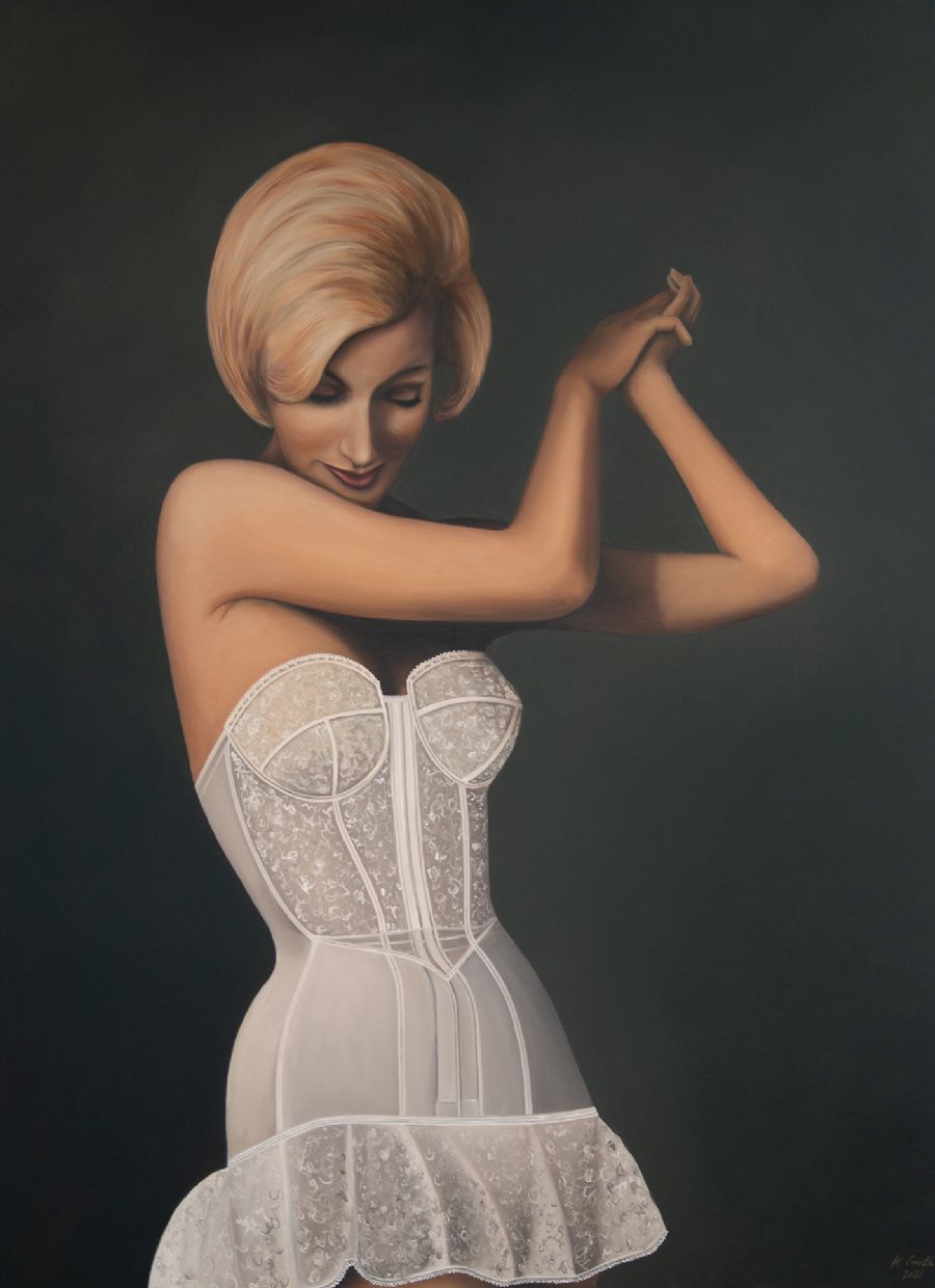 Olie på lærred, 150x110x4 cm. Inspireret af gammel Asani undertøjsreklame fra ugeblad 1962 3 værker i denne serie